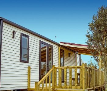 Each mobile home houses a large living room with a contemporary décor with a lounge area and a fully equipped kitchen, 2 or 3 spacious bedrooms (one with double bed), a bathroom with separate WC, as well as a private terrace with picnic table and parasol to enjoy your meals outside.